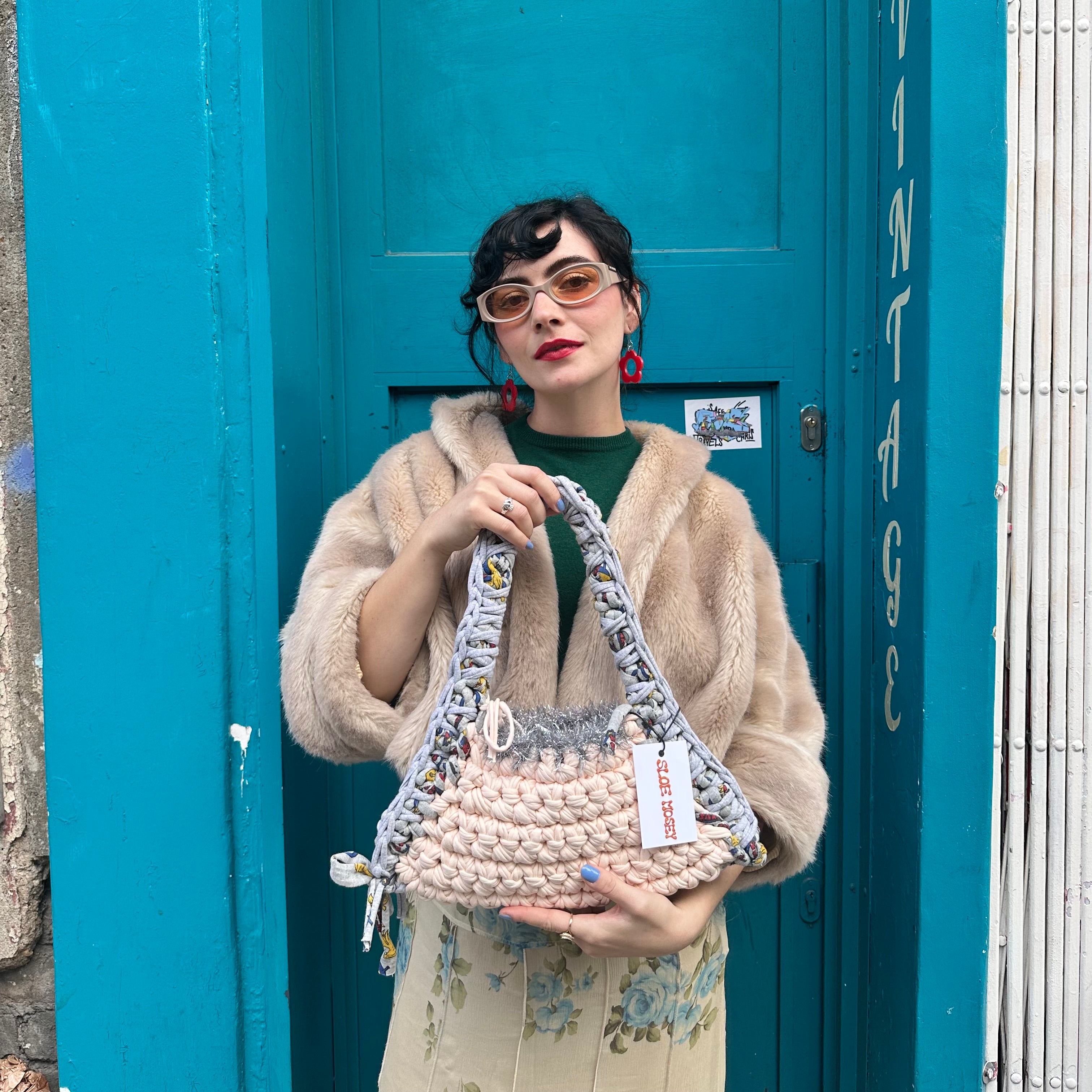At Sloe Mosey we take repurposed t-shirt yarn in bold colours and patterns and top it off with a sprinkling of delectable tinsel to create playful, one of a kind handbags.