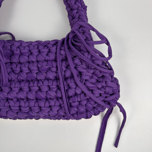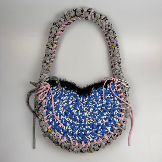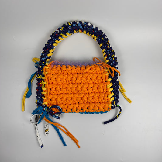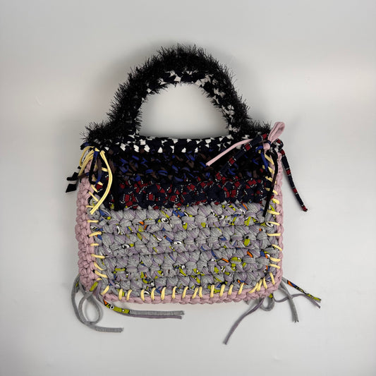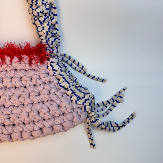 At Sloe Mosey we take repurposed t-shirt yarn in bold colours and patterns and top it off with a sprinkling of delectable tinsel to create playful, one of a kind handbags.
