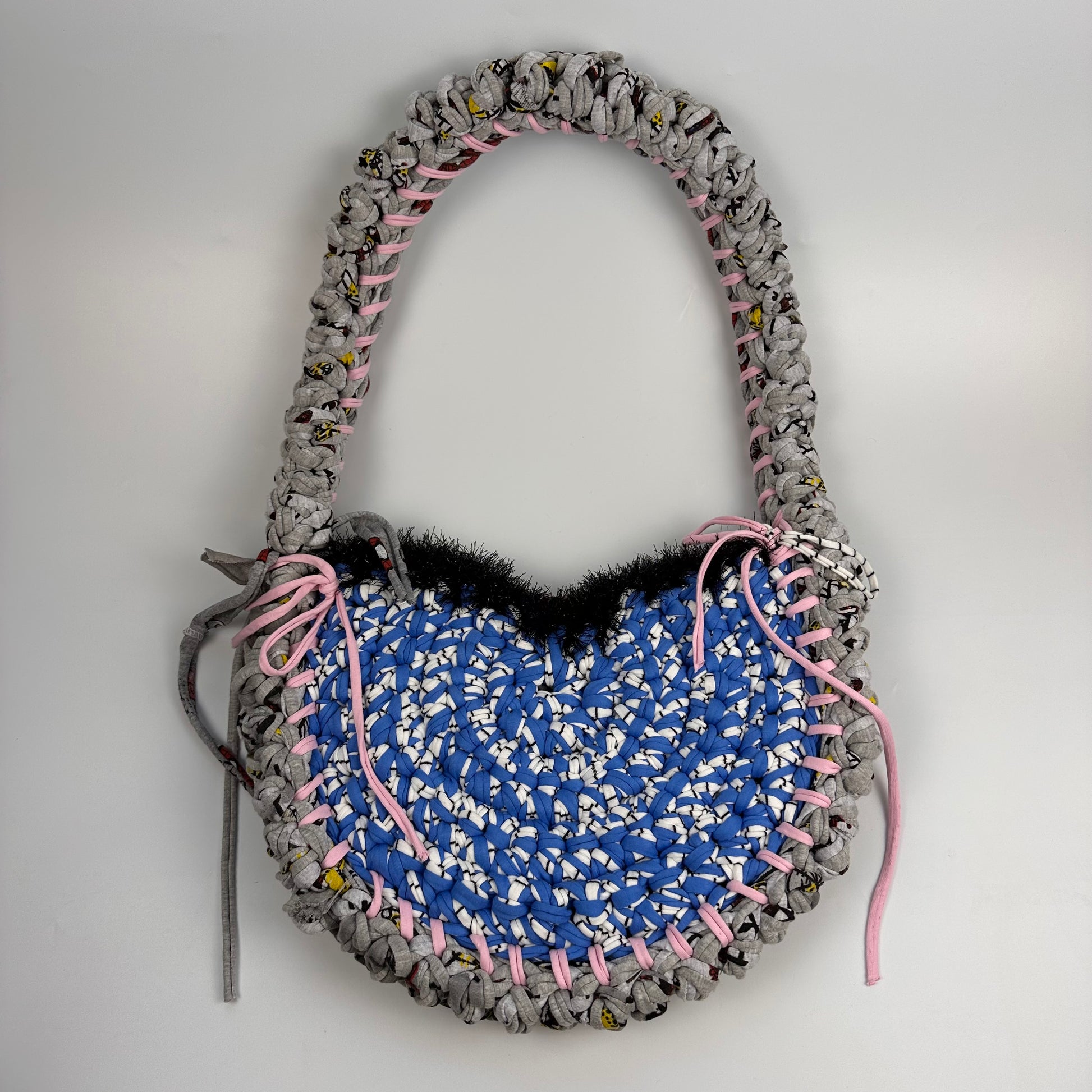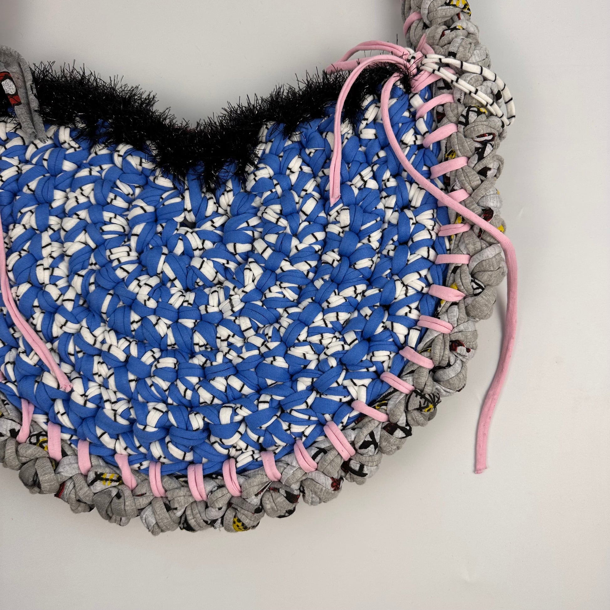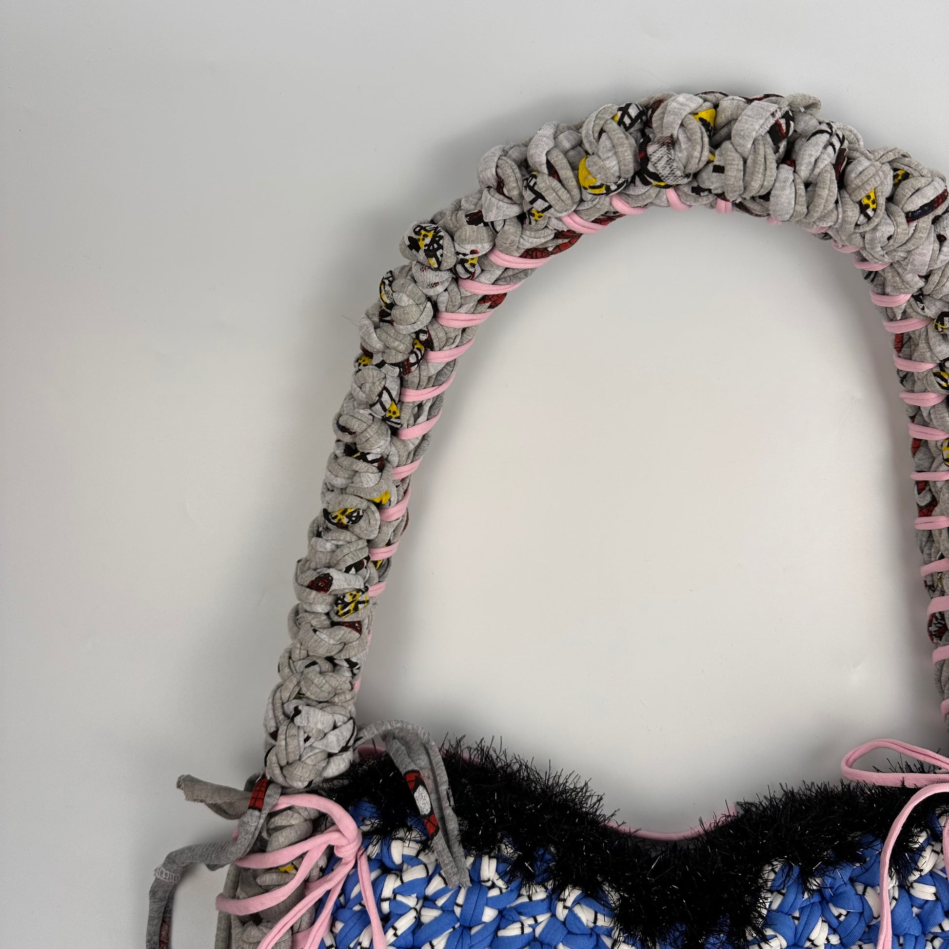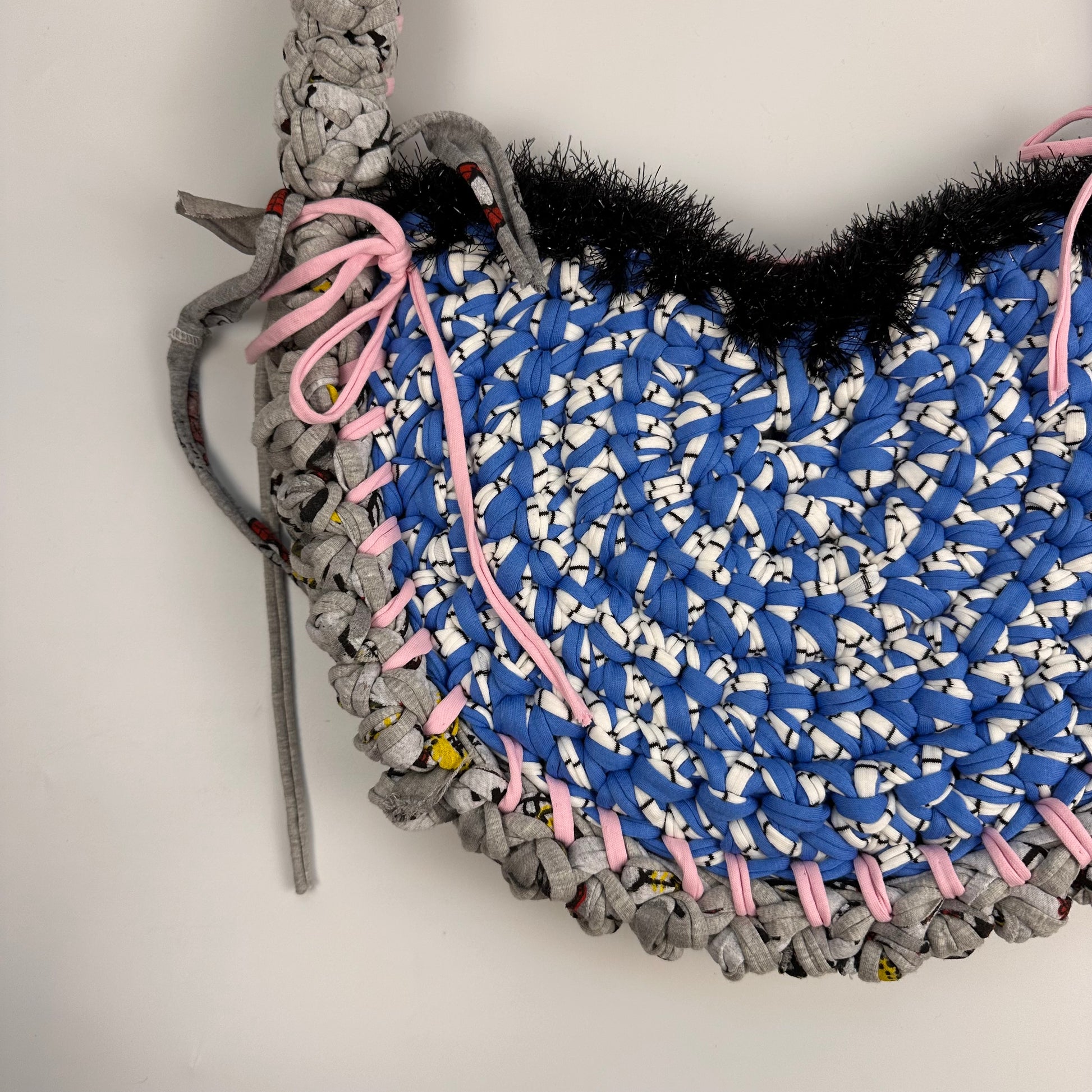 Handmade with repurposed t-shirt yarn in London, UK. The materials used make this bag sturdy and robust to minimise drag and keep shape. With our signature splash of tinsel yarn these bags are sure to be a stunner with any outfit you wear.