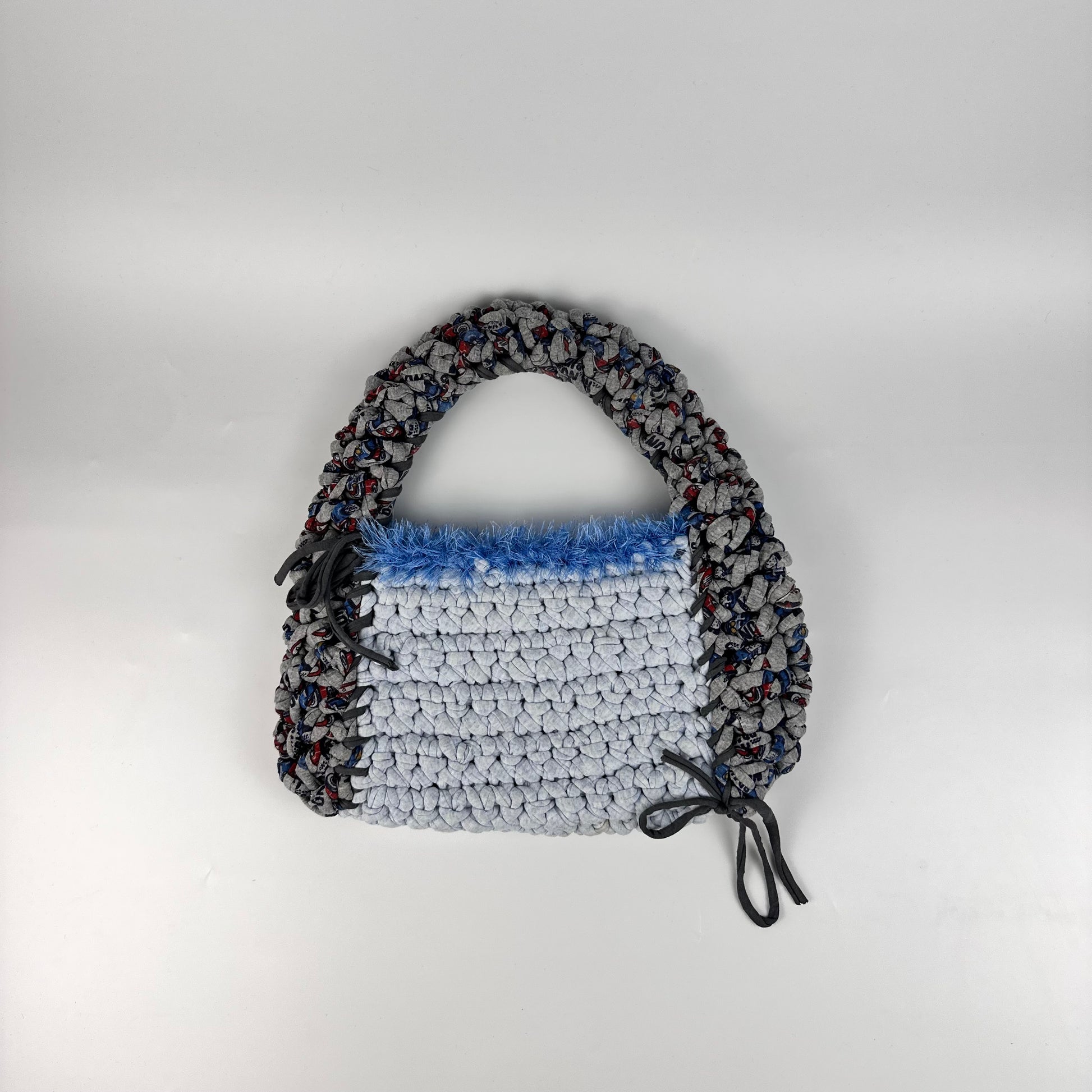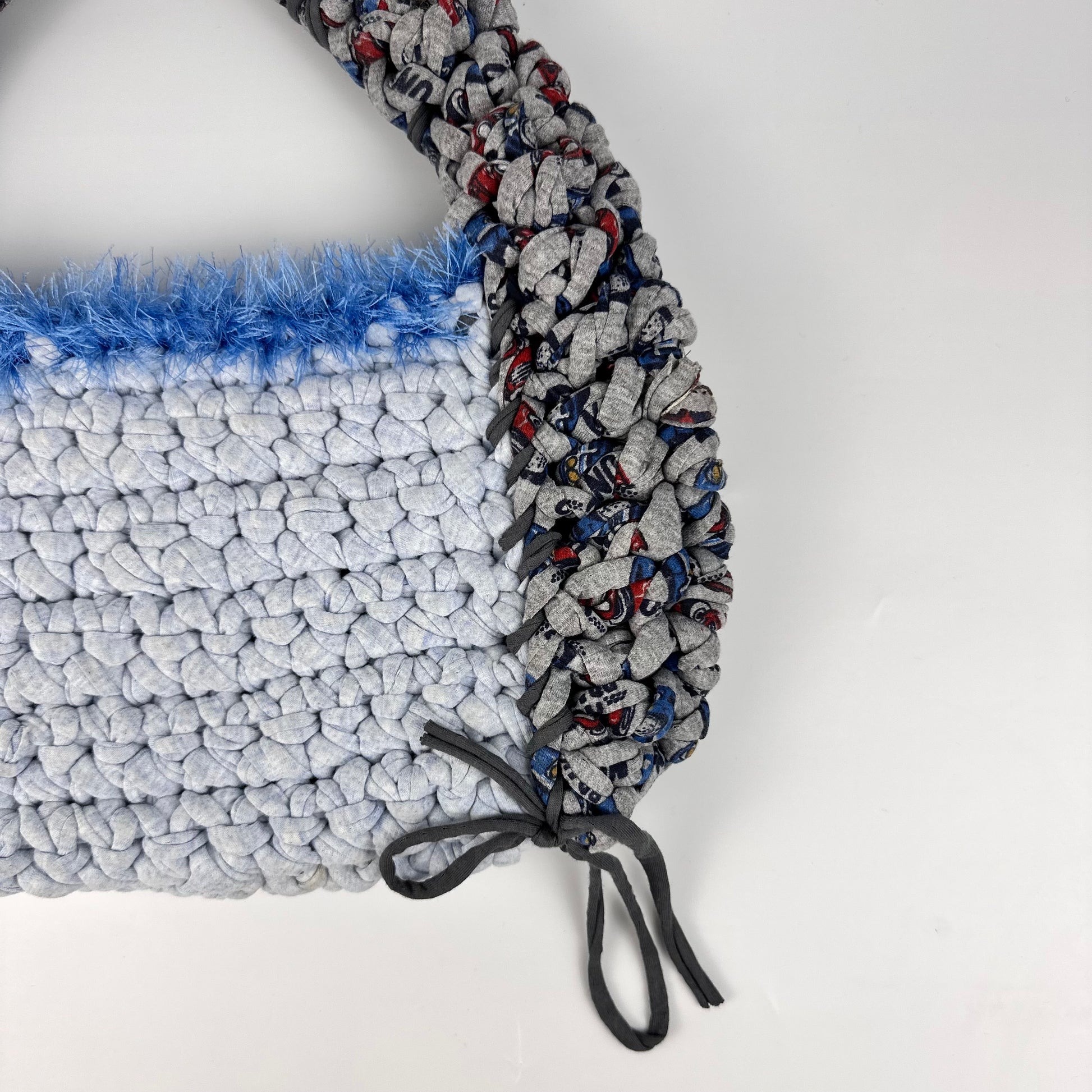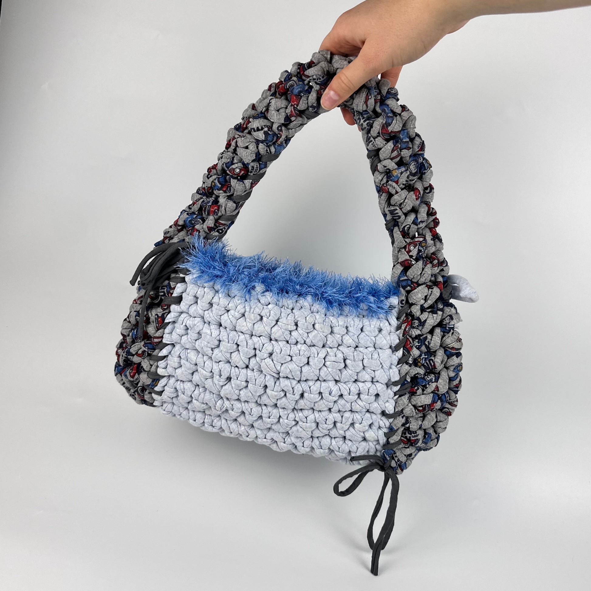Handmade with repurposed t-shirt yarn in London, UK. The materials used make this bag sturdy and robust to minimise drag and keep shape. With our signature splash of tinsel yarn these bags are sure to be a stunner with any outfit you wear.