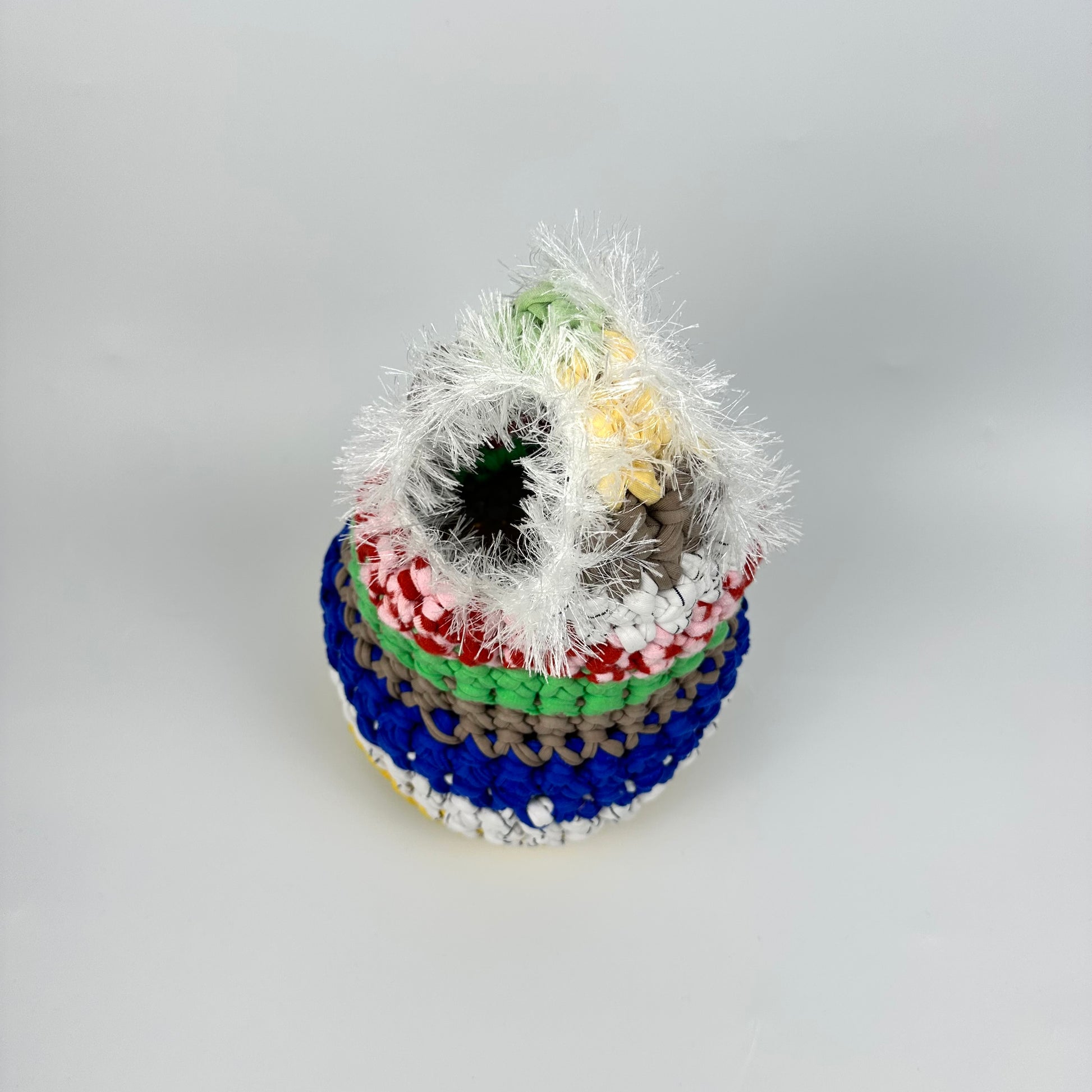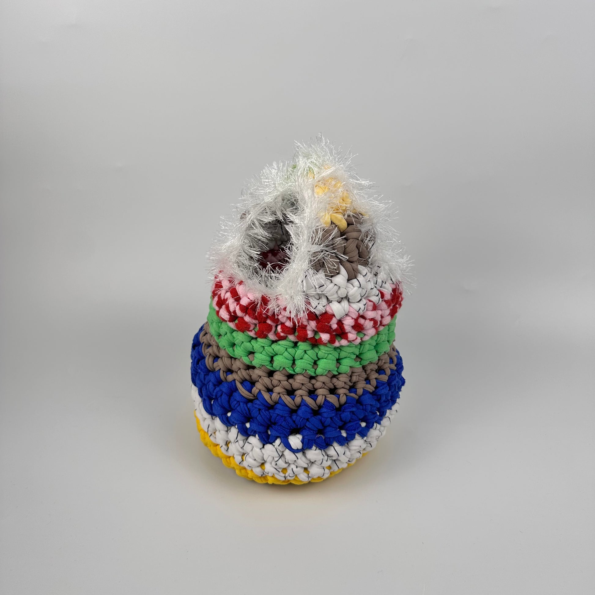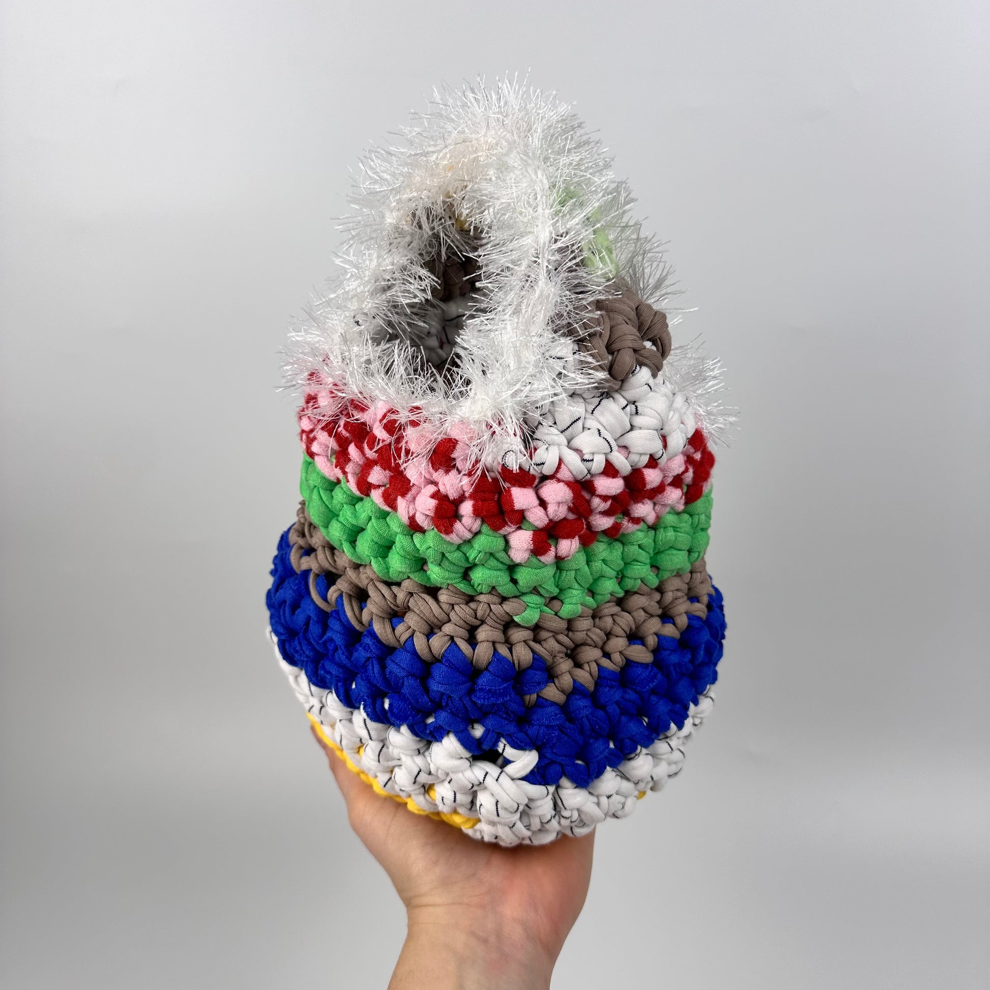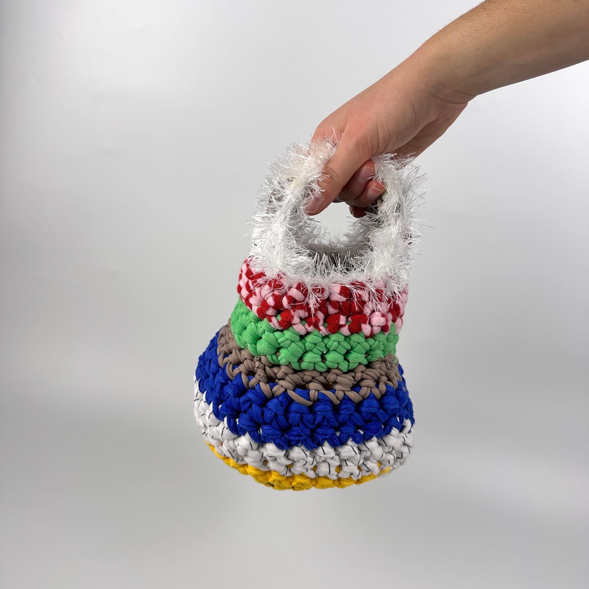 Handmade with repurposed t-shirt yarn in London, UK. The materials used make this bag sturdy and robust to minimise drag and keep shape. With our signature splash of tinsel yarn these bags are sure to be a stunner with any outfit you wear.