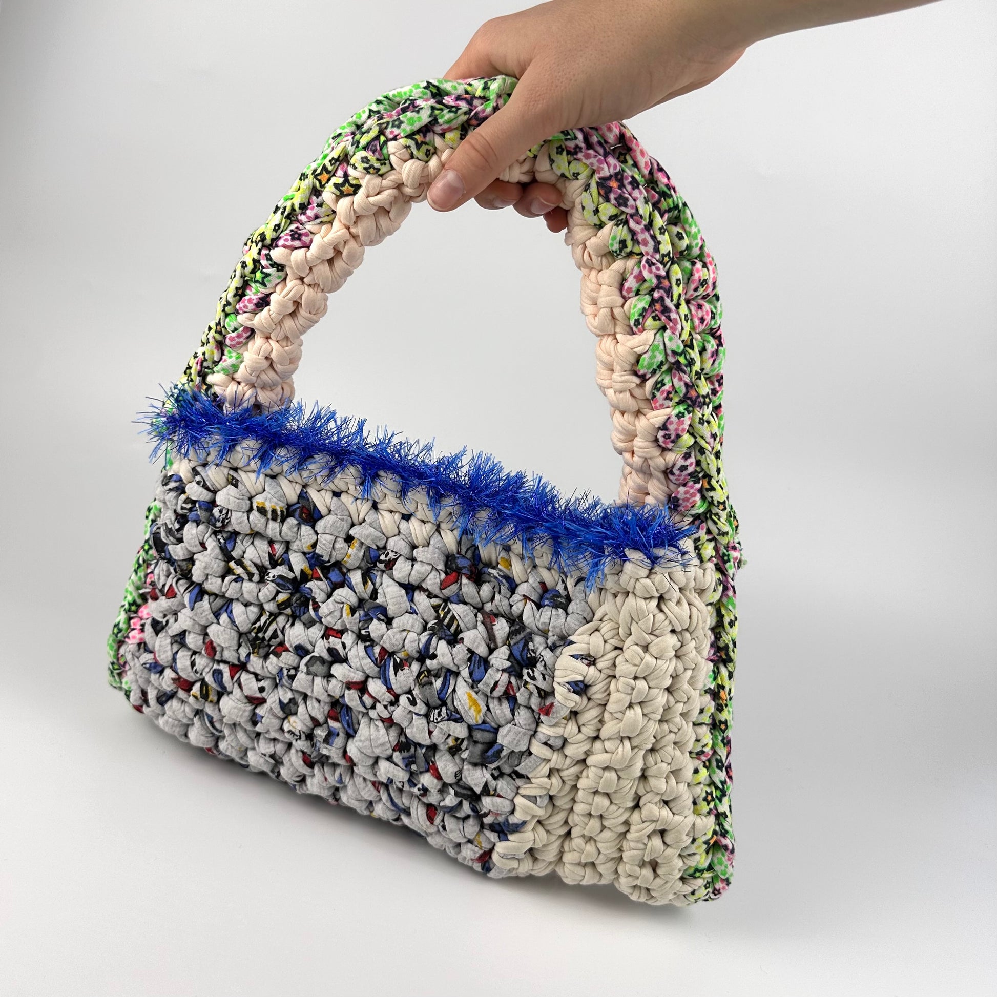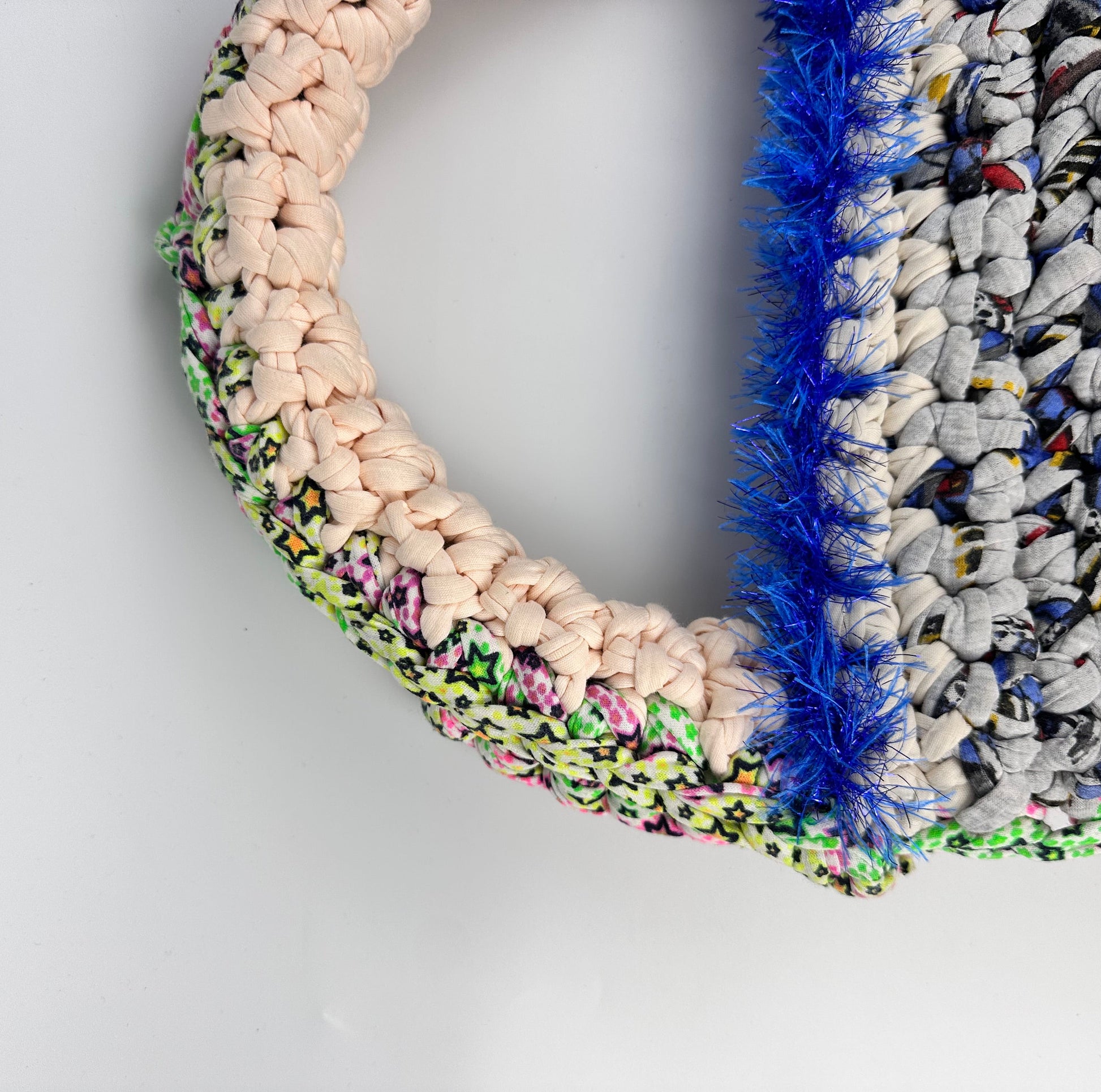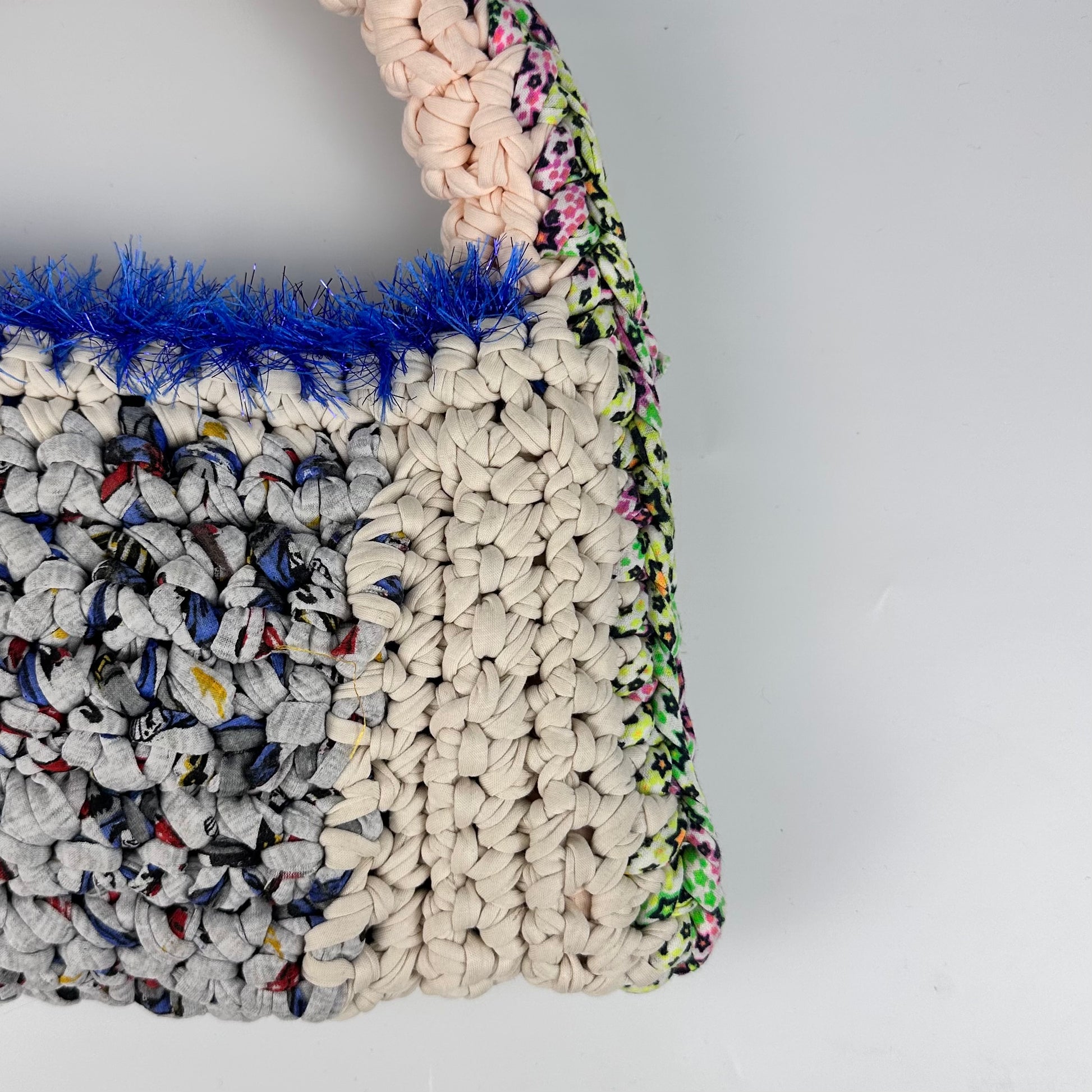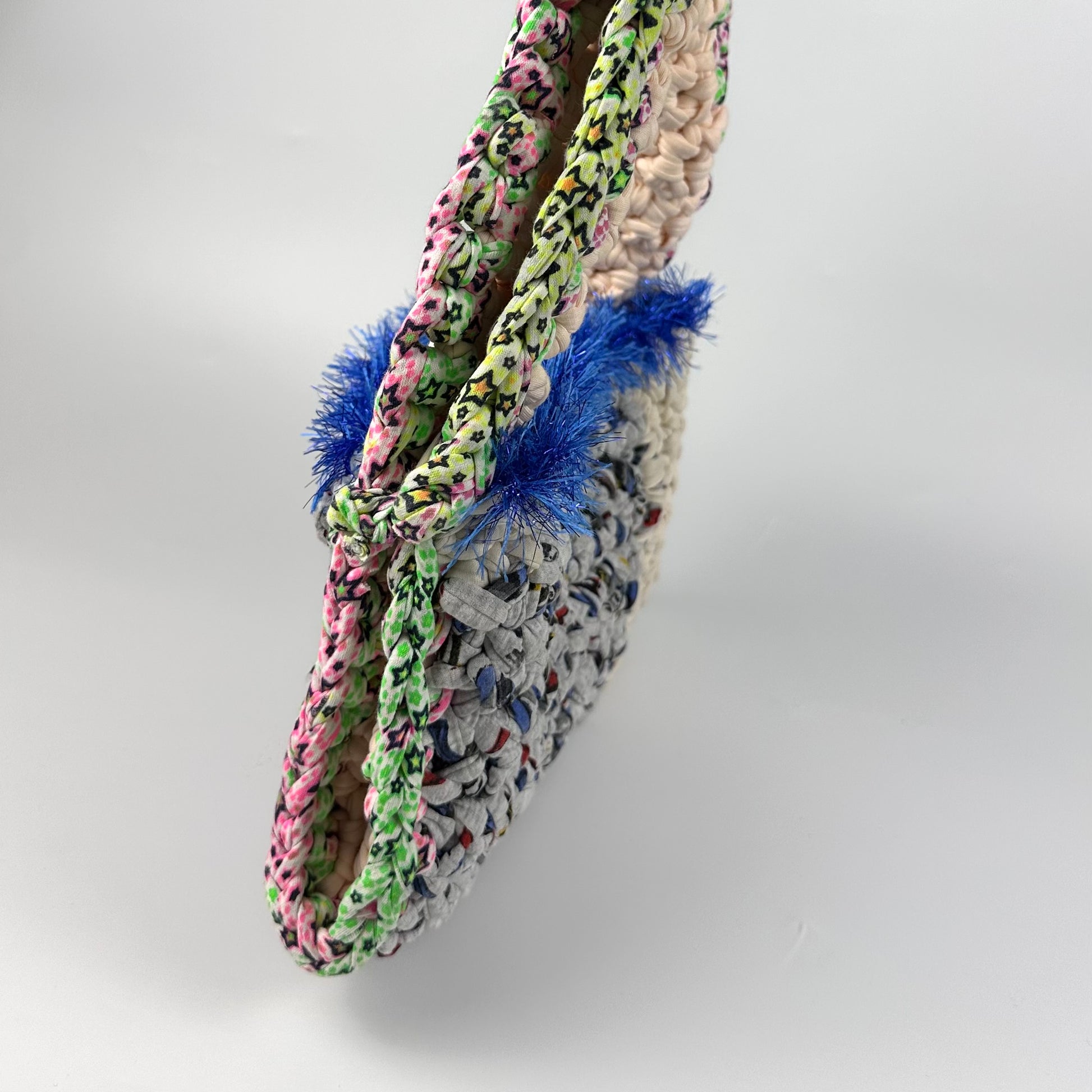 Handmade with recycled t-shirt yarn materials in London, UK. The materials used makes this bag sturdy and robust to minimise drag and keep shape. It comes with a single strand drawstring to close.