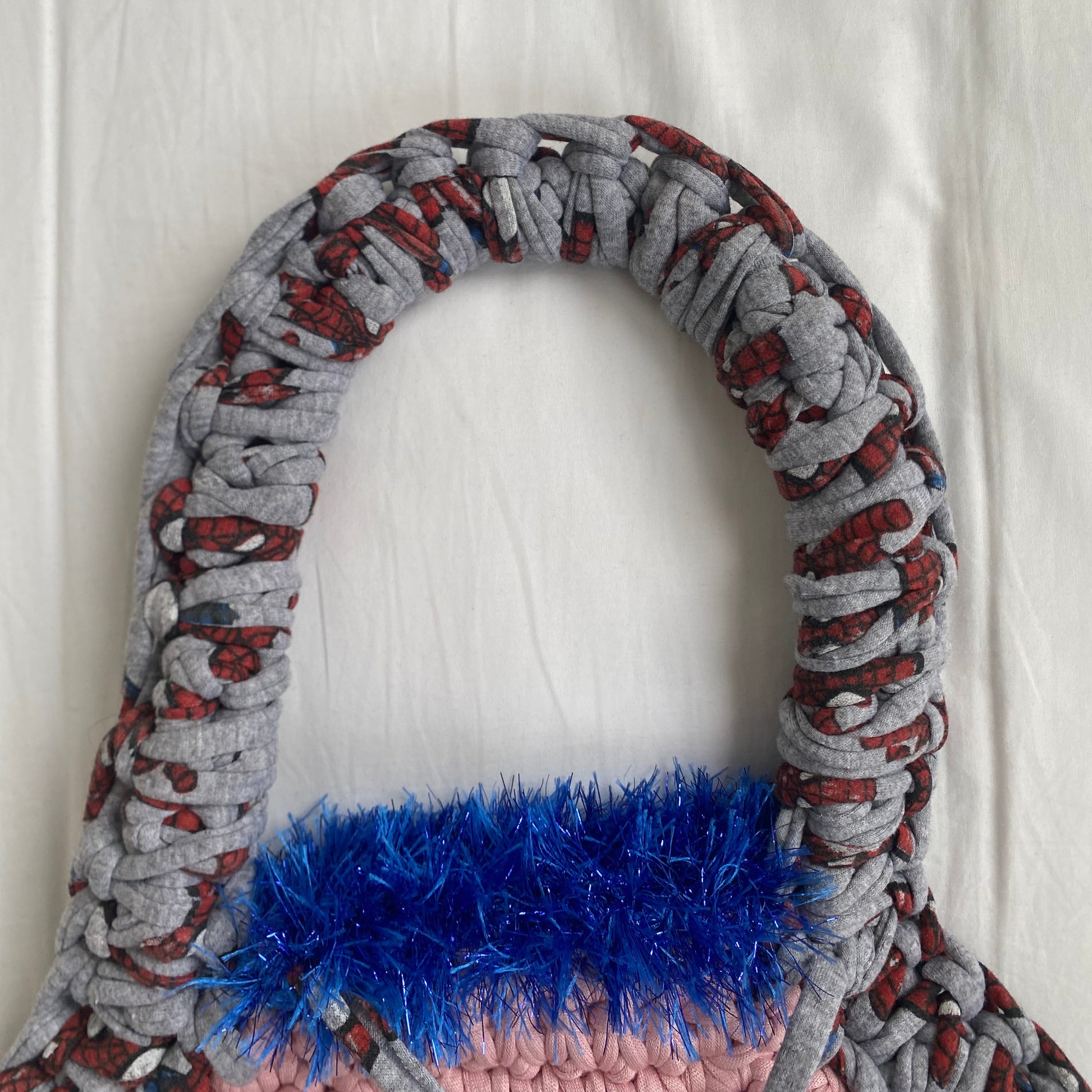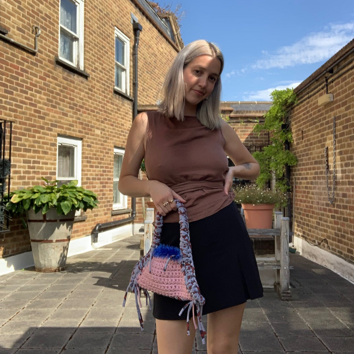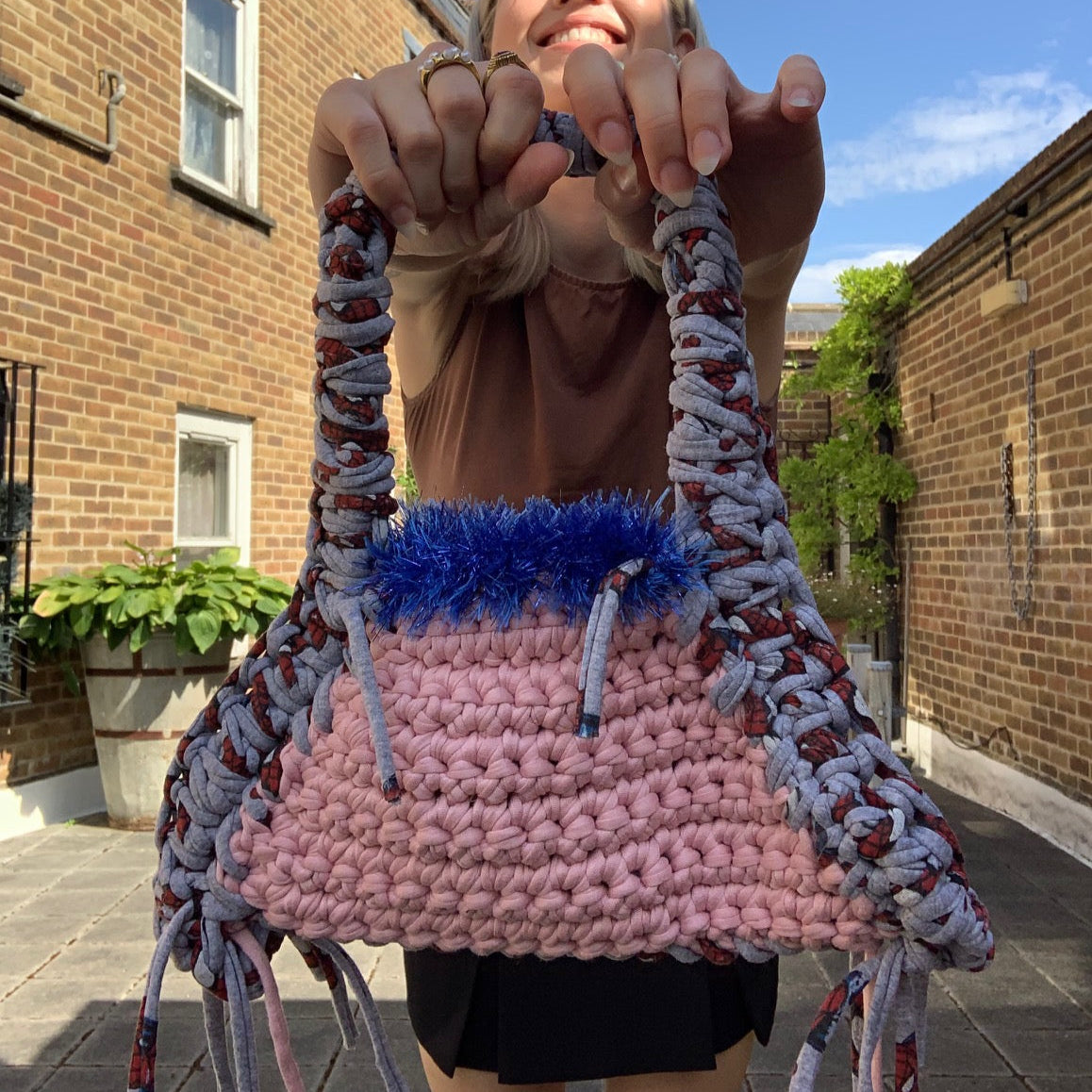 Handmade with recycled t-shirt yarn materials in London, UK. The materials used makes this bag sturdy and robust to minimise drag and keep shape. It comes with a single strand drawstring to close. This bag is more spacious than it appears on photos and is suitable for everyday, special events or simply coffee with a friend.