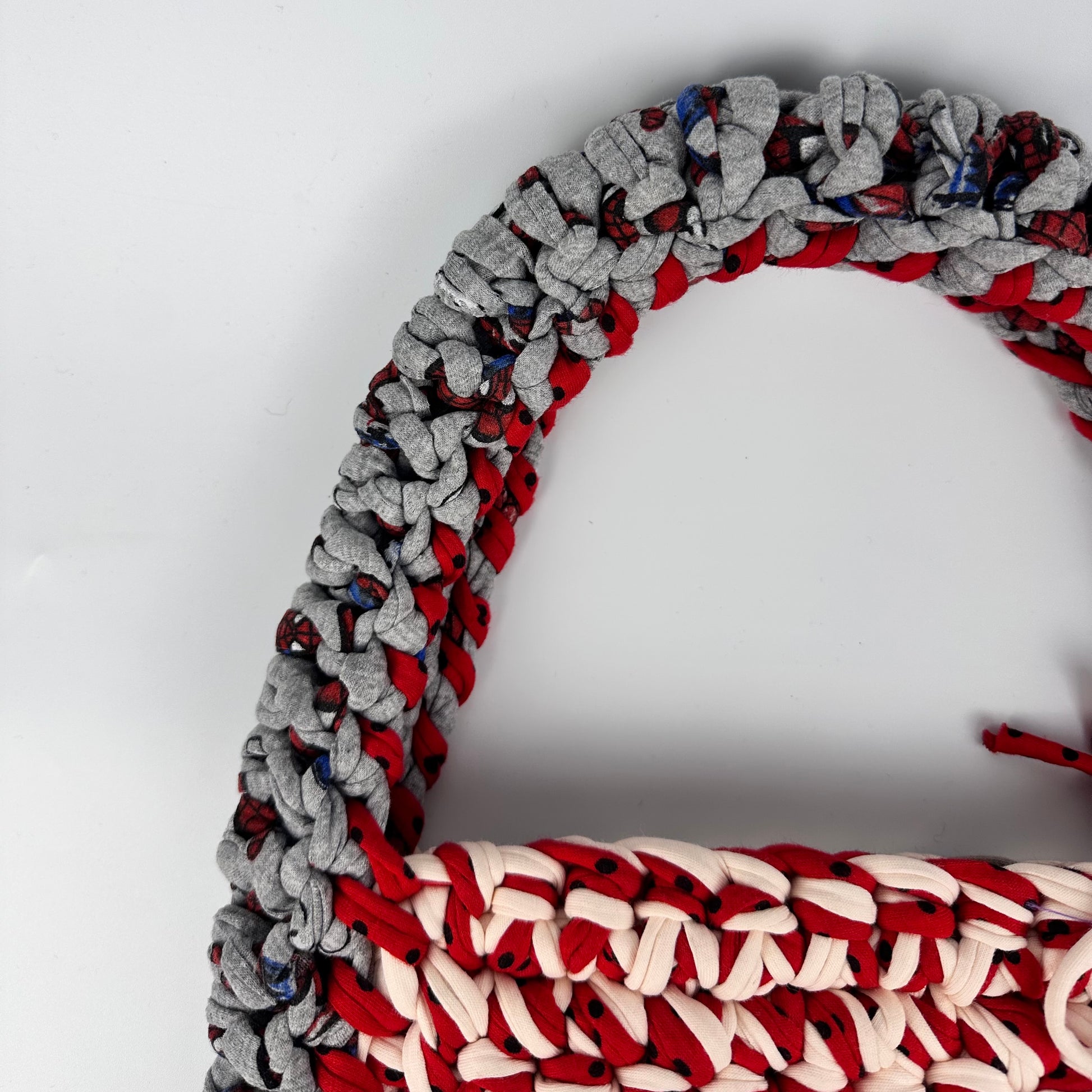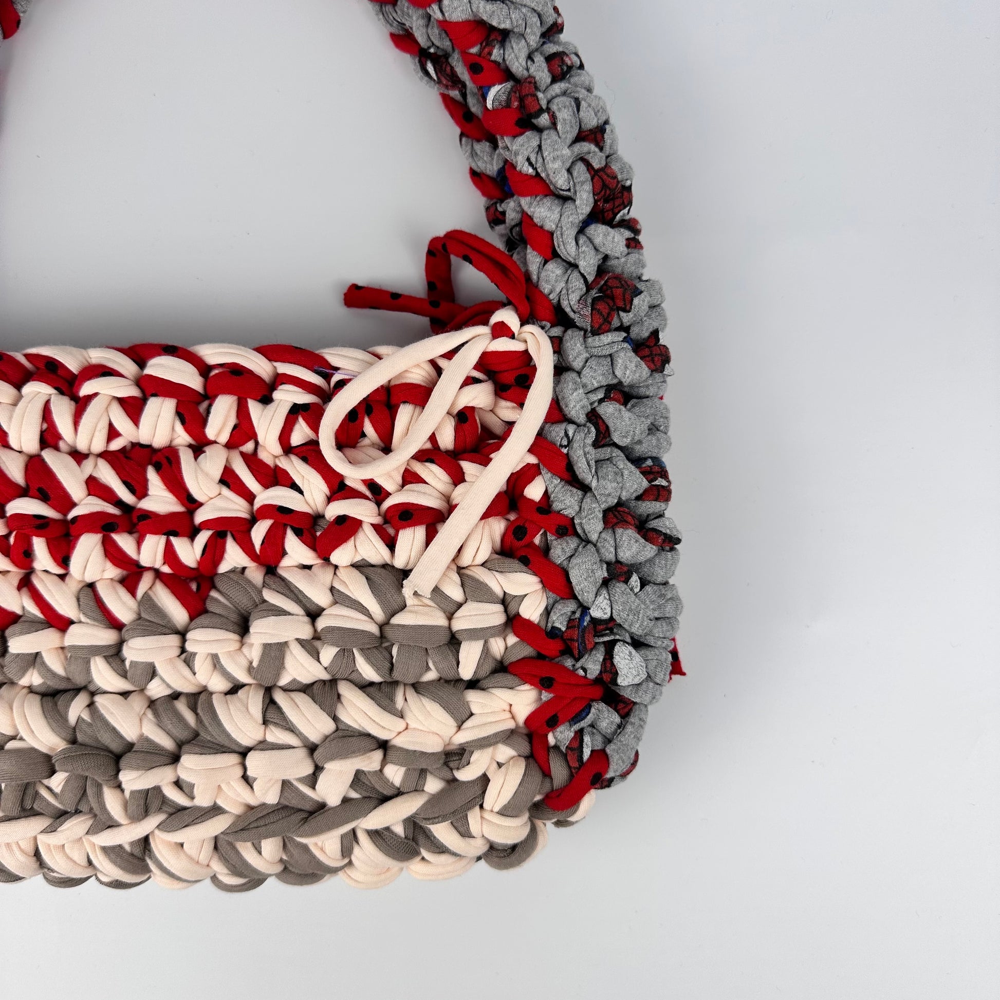 Handmade with repurposed t-shirt yarn in London, UK. The materials used make this bag sturdy and robust to minimise drag and keep shape. With our signature splash of tinsel yarn these bags are sure to be a stunner with any outfit you wear.
